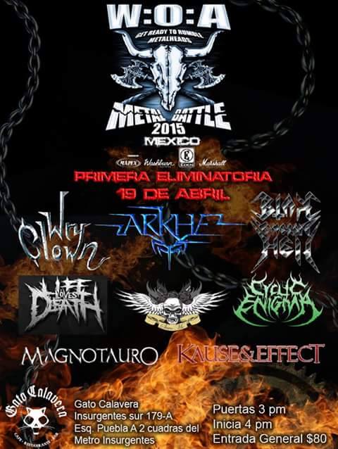 Los esperamos el próximo 19 de abril a las 3PM en la primera eliminatoria de la batalla de bandas rumbo al Wacken Open Air. Queremos representar a México en tan importante festival internacional en Alemania. El evento en vivo para esta eliminatoria será en el Gato Calavera ubicado en Insurgentes sur 179-A a 2 cuadras del metro Insurgentes. No falten su apoyo hace la diferencia. Más información en la en la sección de eventos.