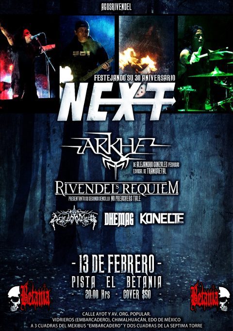 Confirmado el primer evento del año para Arkhe! Será el 13 de febrero en Chimalhuacán, Estado de México. Iniciamos el año compartiendo escenario con Next que están festejando su 30 aniversario, Rivendels Requiem, Dhemag , Arie di Mortte y Konecte! Nos vemos por allá!