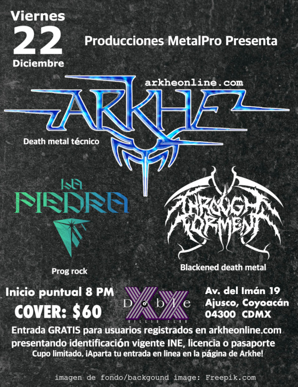 Después de casi 4 años de ausencia de los escenarios Arkhe estará de regreso el sábado 22 de octubre de 2022. El evento será entre 11AM y 2PM, el orden de las bandas será sorteado el día del evento. Eseramos verlos por allá para compartir con ustedes algo de nuestra música.
